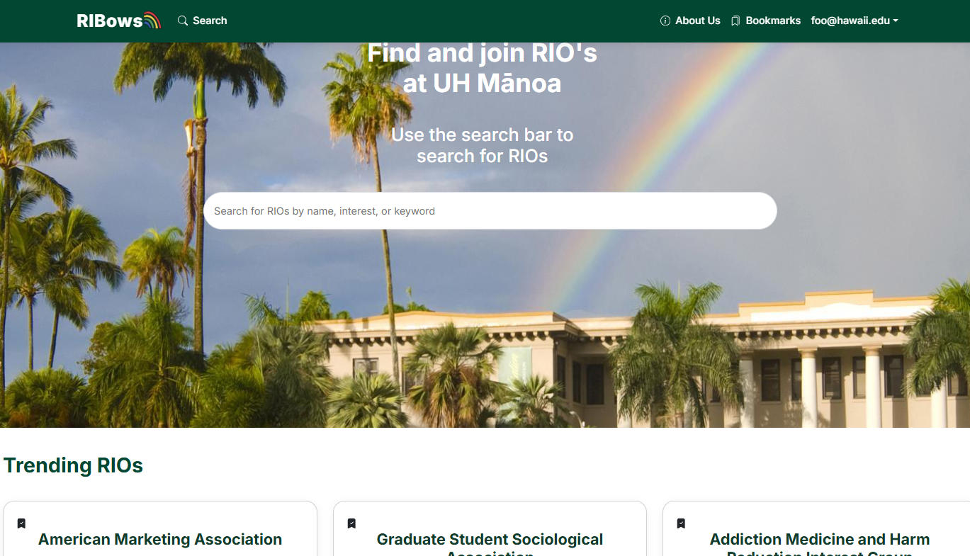 RIBows is a web app that helps UH Mānoa students search for Registered Independent Organizations (RIOs), bookmark them, and explore club details through a clean, card-based interface.